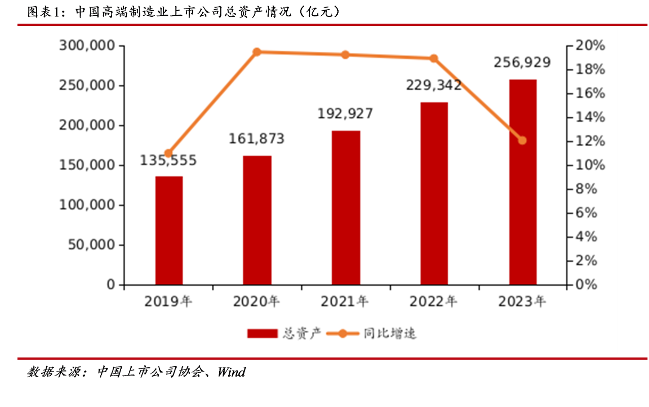 報告顯示,截至2023年末,高端制造業上市公司的總資產規模達到25.69萬億元,占A股上市公司總資產的比例為6.10%,占比相對較低,這與A股上市公司行業分布特點有關,銀行、保險等金融行業上市公司總資產占據了A股上市公司總資產的絕大部分。2023年末高端制造業總資產較2022年末同比增長12.03%,較2019年末增長89.54%,過去5年復合增長率為17.33%,高于A股整體復合增長率10.95%,資產規模快速增長。