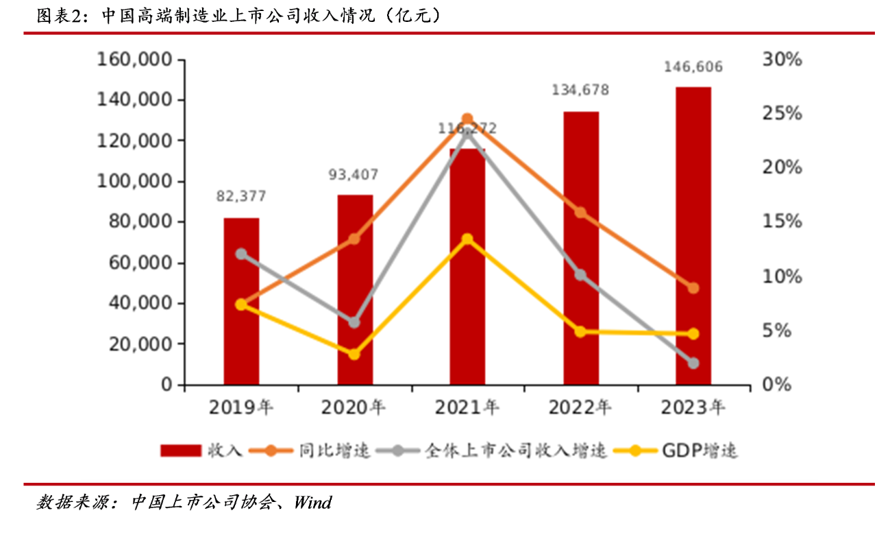 過去5年,我國高端制造業上市公司收入規模持續增長,由2019年的8.24萬億元增長至2023年的14.66萬億元,復合增長率為15.50%,收入增速顯著高于GDP增速,表明高端制造業上市公司仍處于快速發展階段,同時仍是拉動我國經濟增長的強勁動力之一。2023年,在復雜的國際形勢和國內外需求下降的背景下,高端制造業上市公司營業收入同比增速下降至8.86%,但仍大幅領先于A股上市公司2023年整體收入同比增速1.93%,表現出了強勁的發展韌性。
