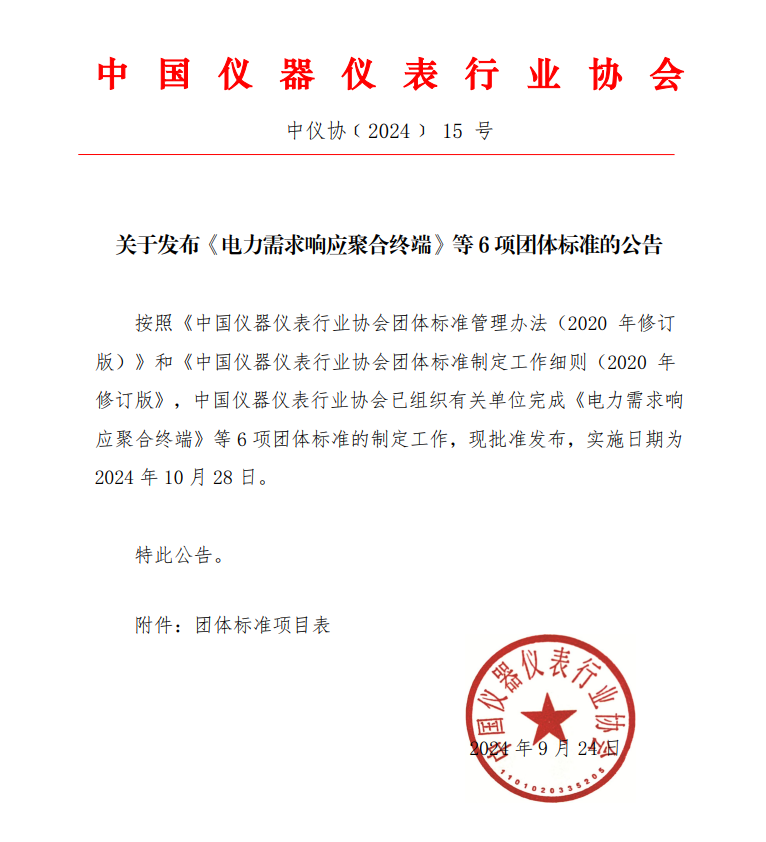 近日,根據《中國儀器儀表行業協會團體標準管理辦法》的規定,中國儀器儀表行業協會(簡稱“協會”)組織完成了由協會電工儀器儀表分會提出的《電力需求響應聚合終端》等4項、試驗儀器分會提出的《溫差電器件致冷性能測試方法》等2項團體標準的制定工作,現予以發布,特此公告。