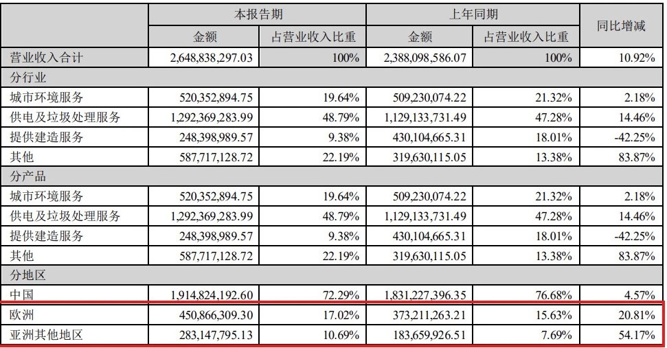 率先布局海外市場的中國環(huán)保企業(yè)已獲得的成果,也驗證了海外市場是當前非常廣闊的增量空間。根據(jù)中國天楹的半年度報告,海外業(yè)務(wù)占營業(yè)收入比重增幅已遠超國內(nèi)業(yè)務(wù),增長潛力值得期待。