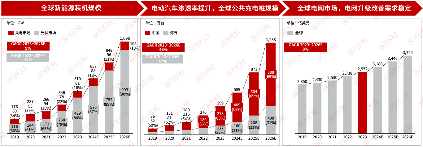 隨著光伏技術(shù)進(jìn)步和產(chǎn)業(yè)規(guī)模化推動(dòng),光伏成本持續(xù)降低,世界光伏新增裝機(jī)量復(fù)合增長(zhǎng)率達(dá)到32%。隨著新能源汽車行業(yè)的發(fā)展,汽車行業(yè)迎來了較高的增長(zhǎng)期,與之對(duì)應(yīng)的充電樁規(guī)模也隨之高速增長(zhǎng),全球公共充電樁市場(chǎng)規(guī)模以48%的復(fù)合增長(zhǎng)率快速增長(zhǎng)。全球電網(wǎng)投資穩(wěn)定增長(zhǎng),預(yù)計(jì)將以8%的復(fù)合增長(zhǎng)率增長(zhǎng),電網(wǎng)升級(jí)改善需求穩(wěn)定。