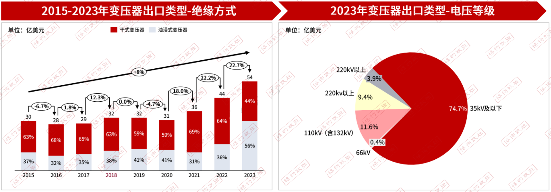 從2015-2023年變壓器出口情況來看,主要以干式變壓器為主,由于干式變壓器相對(duì)油浸式變壓器抗短路能力強(qiáng)且體積小、運(yùn)行效率高的產(chǎn)品特性,干式變壓器價(jià)格高于浸式變壓器,因此市場(chǎng)占比較大。2023年變壓器出口情況來看,35kV及以下電壓等級(jí)變壓器使用行業(yè)更為廣泛,因此占整體電壓等級(jí)的約75%,66kV有少量出口,主要用于海上風(fēng)電等新能源行業(yè),未來市場(chǎng)潛力較大。