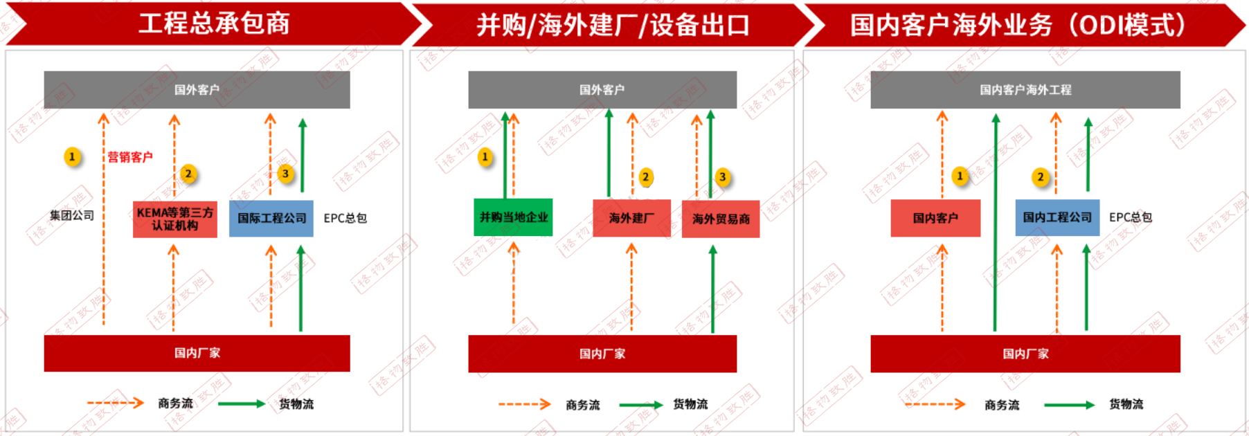 有些國(guó)內(nèi)廠家本身已經(jīng)與國(guó)內(nèi)客戶建立一定的合作關(guān)系,當(dāng)國(guó)內(nèi)客戶有海外業(yè)務(wù)需求時(shí),也會(huì)尋求原本合作且具有出海能力的廠家進(jìn)行再次合作,國(guó)內(nèi)廠商通過國(guó)內(nèi)工程公司進(jìn)行業(yè)務(wù)開展。
