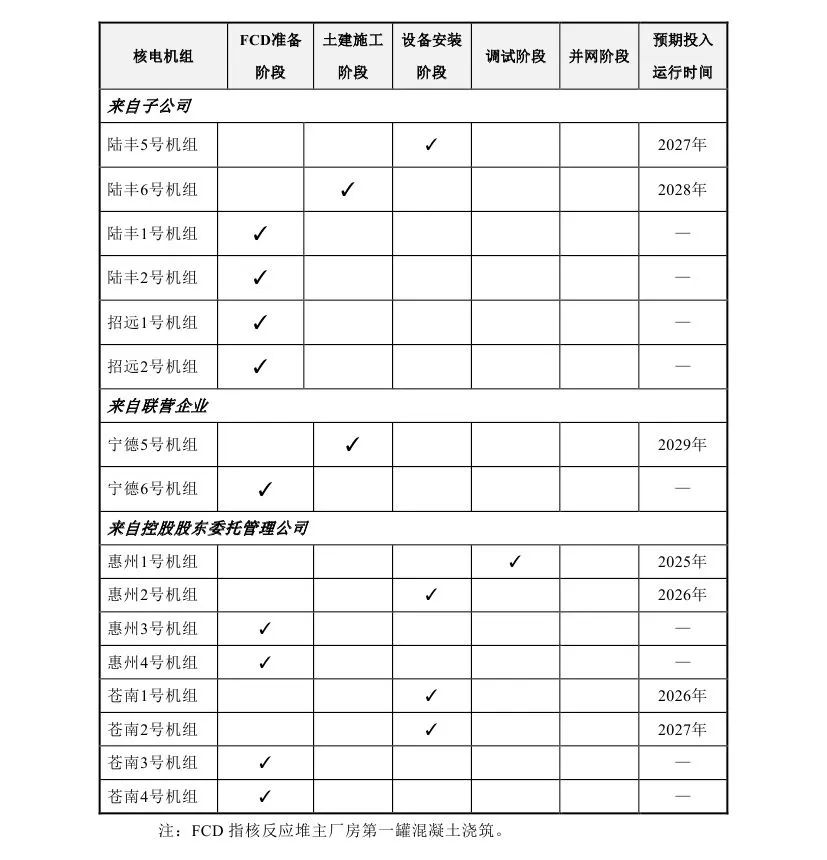 中國廣核表示,截至2024年9月30日,本集團共管理16臺已核準待FCD及在建核電機組(包括本公司控股股東委托本公司管理的8臺機組),1臺處于調試階段,4臺處于設備安裝階段,2臺處于土建施工階段,9臺處于FCD準備階段。在建機組的建設進展詳見下表: