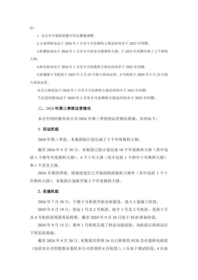 據悉,中國廣核近日披露2024年第三季度運營情況。