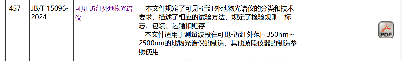 《可見-近紅外地物光譜儀》規(guī)定了可見-近紅外地物光譜儀的分類和技術要求。還對檢驗規(guī)則、標志、包裝、運輸和貯存等環(huán)節(jié)作出了詳細規(guī)定,為產(chǎn)品制造和質(zhì)量控制提供了完整的指導體系。
