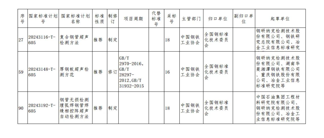 國家標準化管理委員會通知本次獲批推薦性國家標準計劃共計220項,鋼研納克無損檢測專業牽頭起草標準2項,參研1項(其中2項標準制定、1項標準修訂),見下表: