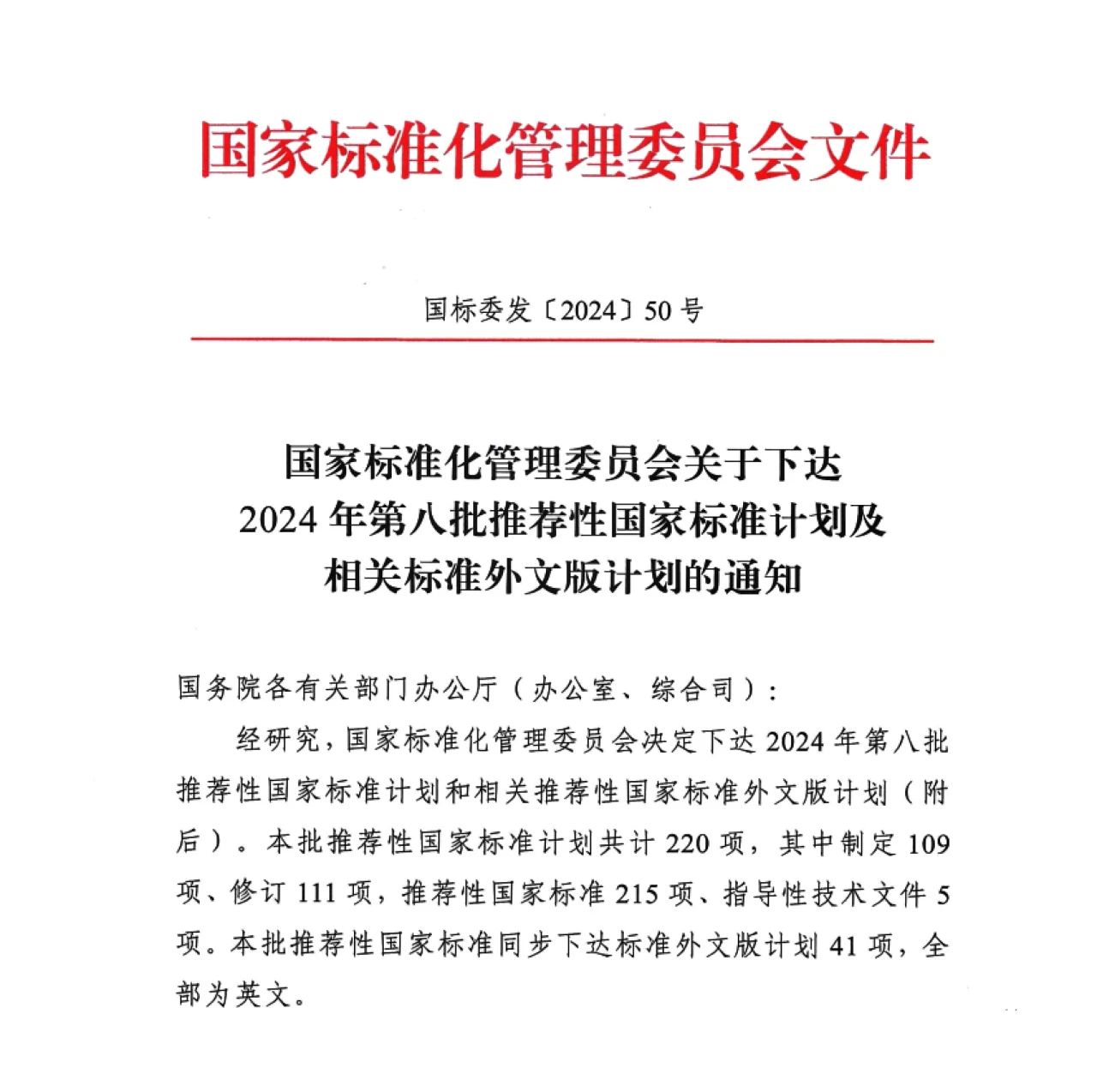 2024年10月26日,國家標準化管理委員會決定下達2024年第八批推薦性國家標準計劃和相關推薦性國家標準外文版計劃。