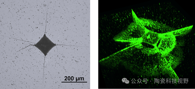 通過(guò)金相顯微鏡觀察到的引入氧化鋁中的維氏壓痕和裂紋的反射圖像(左)