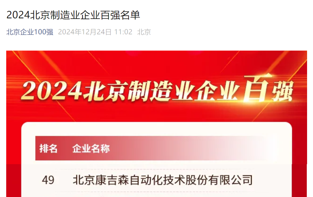 康吉森股份連續(xù)三年榮登“北京制造業(yè)企業(yè)百強”榜單