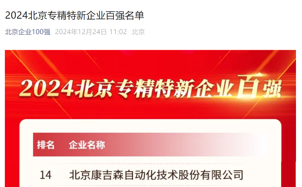 20241224日,“2024京津冀產(chǎn)業(yè)鏈供應(yīng)鏈協(xié)同發(fā)展大會暨北京百強企業(yè)論壇發(fā)布了2024北京企業(yè)百強榜單,北京康吉森自動化技術(shù)股份有限公司(以下簡稱康吉森股份)榮登“2024北京制造業(yè)企業(yè)百強” “2024北京專精特新企業(yè)百強榜單。