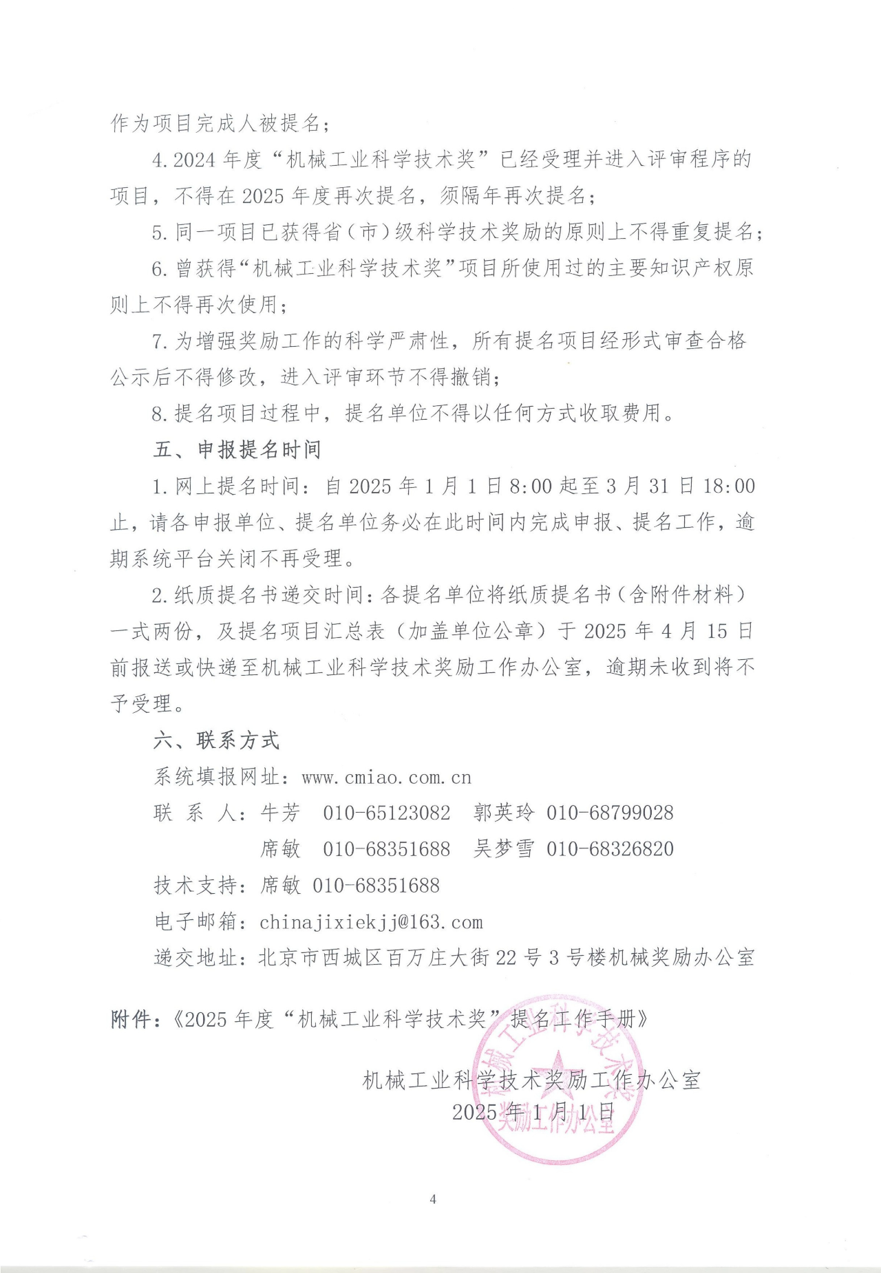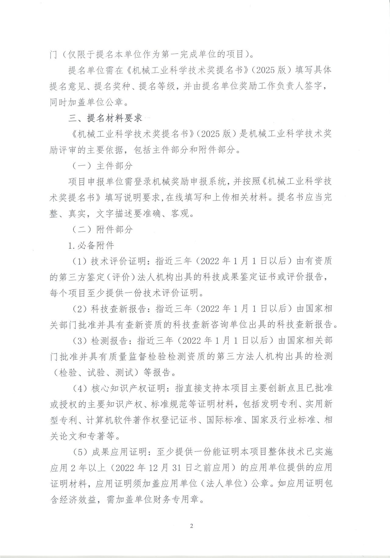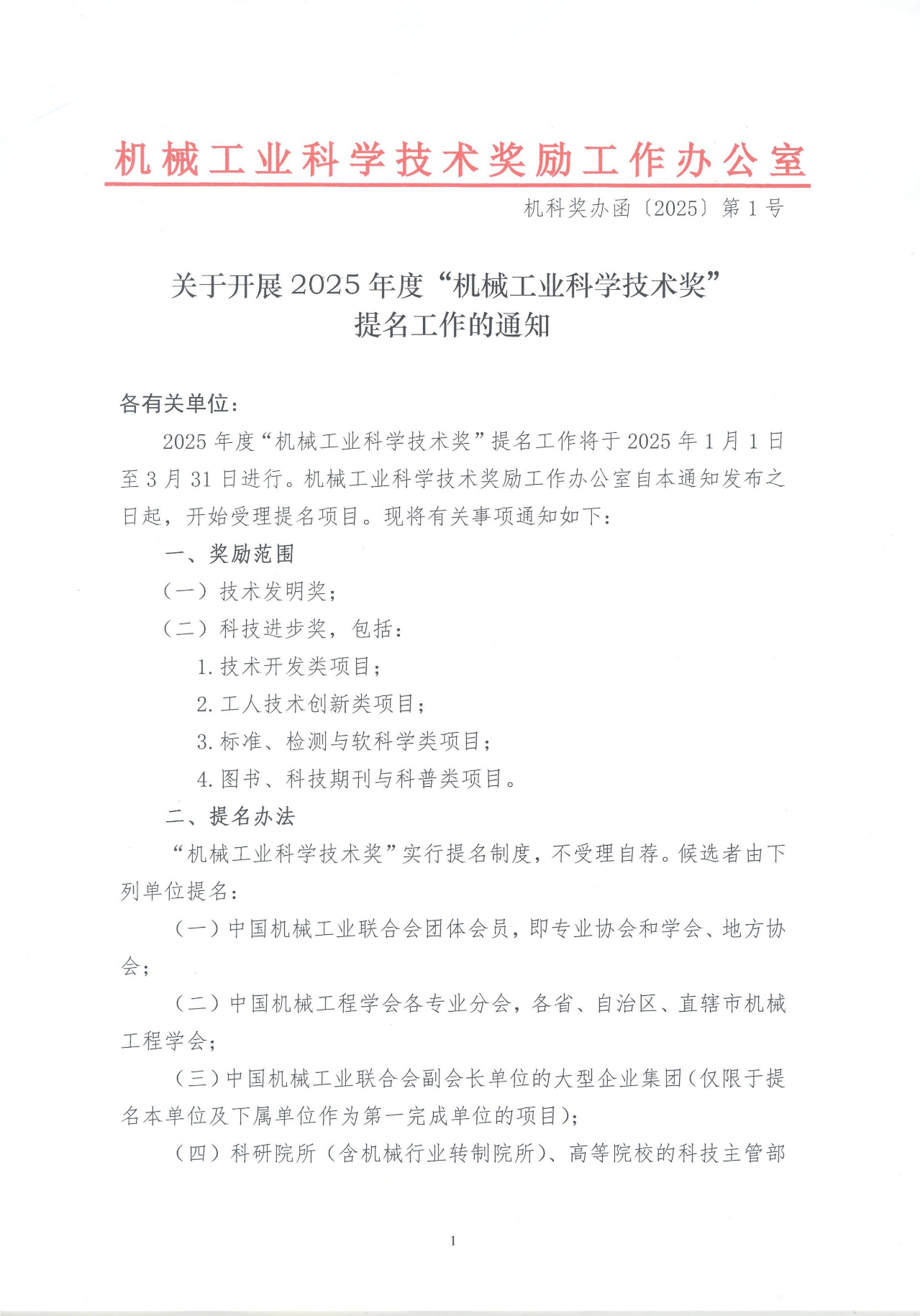 2025年度“機械工業(yè)科學技術獎”提名工作將于2025年1月1日至3月31日進行。機械工業(yè)科學技術獎勵工作辦公室自本通知發(fā)布之日起,開始受理提名項目。現(xiàn)將有關事項通知如下:(詳見通知正文)
