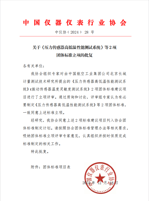 根據(jù)《中國(guó)儀器儀表行業(yè)協(xié)會(huì)團(tuán)體標(biāo)準(zhǔn)管理辦法》的規(guī)定,經(jīng)審查,對(duì)由中國(guó)航空工業(yè)集團(tuán)公司北京長(zhǎng)城計(jì)量測(cè)試技術(shù)研究所(簡(jiǎn)稱(chēng)“304所”)提出的《壓力傳感器高低溫性能測(cè)試系統(tǒng)》 《振動(dòng)傳感器高低溫性能測(cè)試系統(tǒng)》2項(xiàng)團(tuán)體標(biāo)準(zhǔn)進(jìn)行立項(xiàng)(標(biāo)準(zhǔn)編號(hào)和標(biāo)準(zhǔn)名稱(chēng)見(jiàn)公告附件),特此公告。