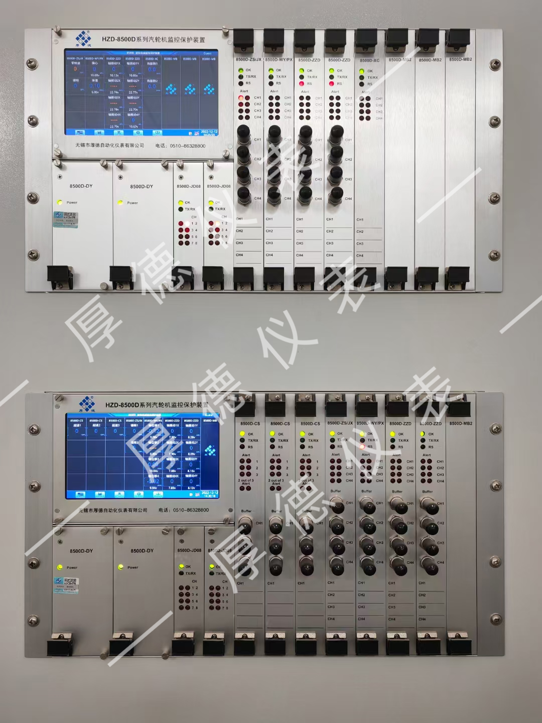 汽輪機(jī)是電力等行業(yè)的關(guān)鍵設(shè)備,一旦發(fā)生故障,造成的損失非常嚴(yán)重。汽輪機(jī)監(jiān)視系統(tǒng) (Turbine Supervisory Instruments,簡稱TSI)是用于在機(jī)組啟停和正常運(yùn)行中進(jìn)行實(shí)時監(jiān)測的保護(hù)系統(tǒng),并提供超限報警、停機(jī)保護(hù)等功能,對汽輪機(jī)組的安全運(yùn)行起著重要的作用,已成為汽輪機(jī)組必不可少的關(guān)鍵設(shè)備之一。TSI系統(tǒng)可以被視為汽輪機(jī)的“心臟聽診器”,監(jiān)視著火電廠安全運(yùn)行的每一次“跳動”。我公司研發(fā)生產(chǎn)的HZD-8500D系列汽輪機(jī)監(jiān)控保護(hù)裝置,主要用于測量汽輪機(jī)軸振、瓦振、偏心、轉(zhuǎn)速、位移和差脹等信號。其液晶屏上集中顯示各監(jiān)控模塊的組態(tài)參數(shù)、實(shí)時數(shù)據(jù)、趨勢曲線,集成了數(shù)據(jù)采集卡件,將傳感器信號直接采集成數(shù)字信號存儲并傳輸至后端處理設(shè)備,大大提高了設(shè)備監(jiān)測的數(shù)字化和智能化水平!