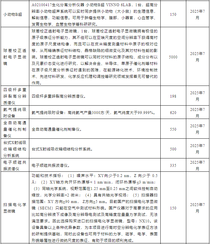 中國科學院大連化學物理研究所2025年7月儀器設備采購意向匯總表