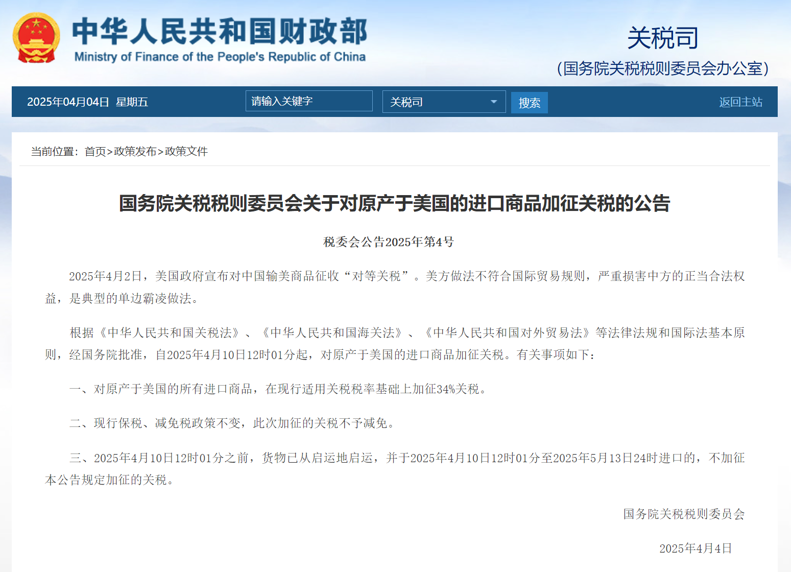 4月2日,美國政府宣布對所有貿(mào)易伙伴加征“對等關(guān)稅”,對中國商品加征稅率高達(dá)34%;4月4日,中國國務(wù)院關(guān)稅稅則委員會發(fā)布公告,自4月10日起對原產(chǎn)于美國的所有進(jìn)口商品同等加征34%關(guān)稅。