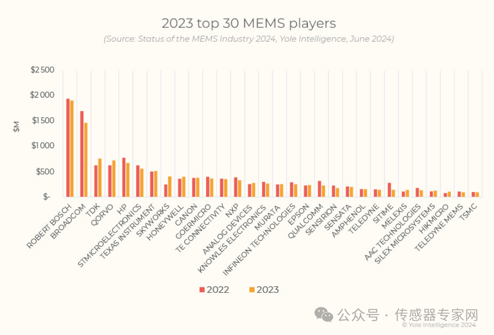 從全球MEMS廠商TOP 30名單來(lái)看,來(lái)自美國(guó)的廠商有Broadcom(博通)、Qorvo、Hewlett Packard(惠普)、Texas Instruments(德州儀器)、Skyworks、Honeywell(霍尼韋爾)、Analog Devices(ADI)、Knowles Electronics(樓氏電子)、Qualcomm(高通)、Sensata(森薩塔)、Amphenol(安費(fèi)諾)、Teledyne(FLIR,MEMS)、Si Time等,占據(jù)榜單的近一半。