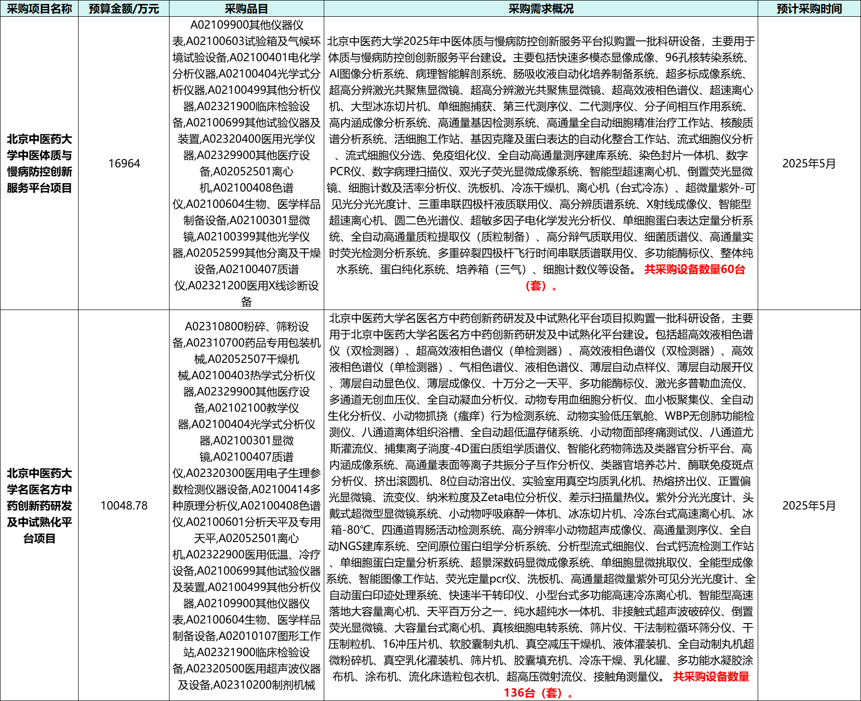 4月25日,北京中醫(yī)藥大學(xué)在中國政府采購網(wǎng)連續(xù)發(fā)布兩項采購意向,采購金額總計為27012.78萬元。此前,北京中醫(yī)藥大學(xué)名醫(yī)名方中藥創(chuàng)新藥研發(fā)及中試熟化平臺項目計劃采購的10048.78萬元項目,隨后,北京中醫(yī)藥大學(xué)再就北京中醫(yī)藥大學(xué)中醫(yī)體質(zhì)與慢病防控創(chuàng)新服務(wù)平臺項目發(fā)布16964萬元采購項目,且計劃采購日期為5月份。仔細(xì)梳理兩個項目擬采購的儀器設(shè)備發(fā)現(xiàn),本次擬采購的儀器設(shè)備除涵蓋色譜、質(zhì)譜等大型分析類儀器,光學(xué)儀器、前處理儀器以及生化分析儀器等也在本次擬采購范圍之內(nèi)。詳細(xì)信息如下: