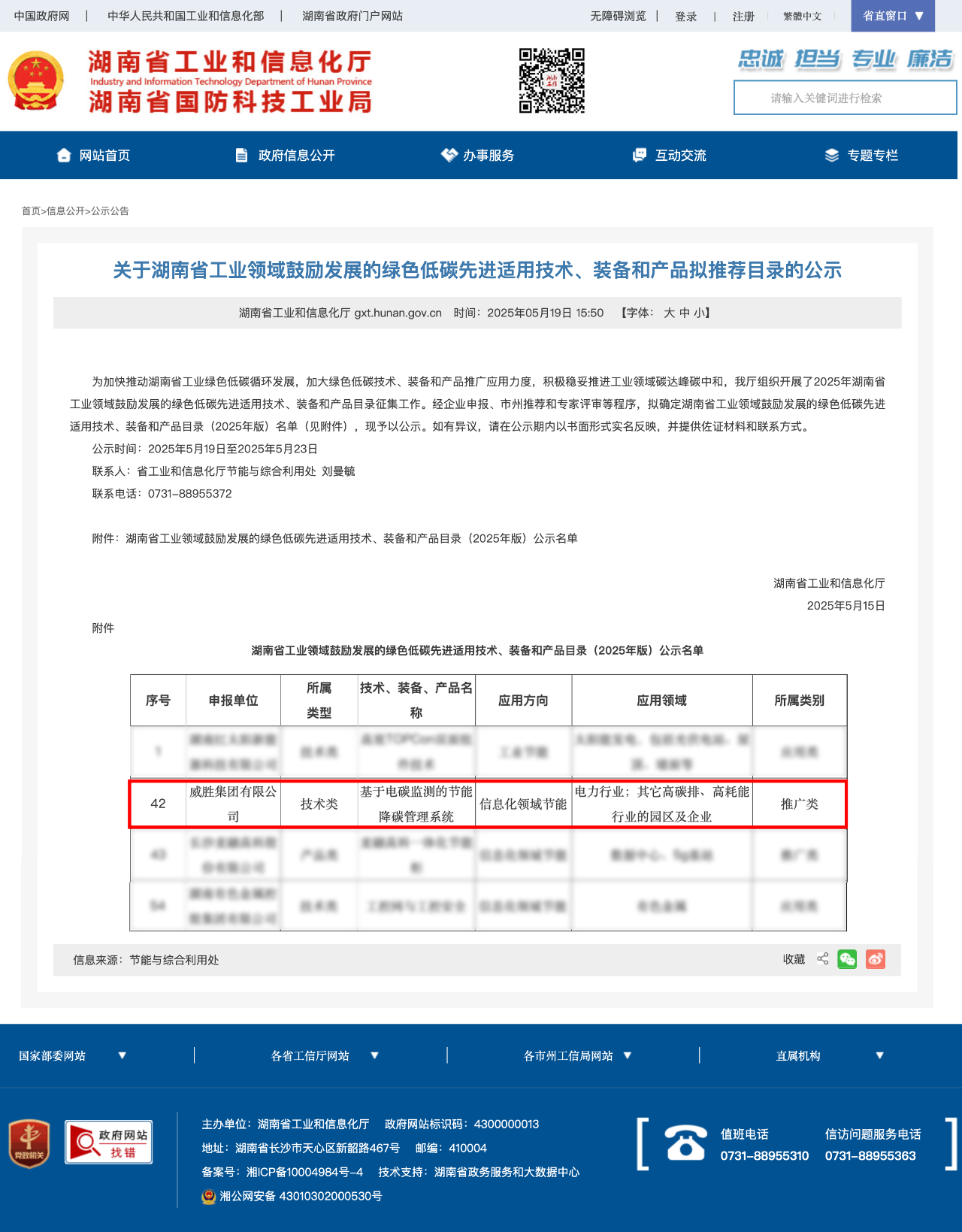 近日,由湖南省工業和信息化廳組織開展了湖南省工業領域鼓勵發展的綠色低碳先進適用技術、裝備和產品推薦目錄征集工作。經企業申報、市州推薦和專家評審等程序,威勝集團基于電碳監測的節能降碳管理系統榮登榜單。