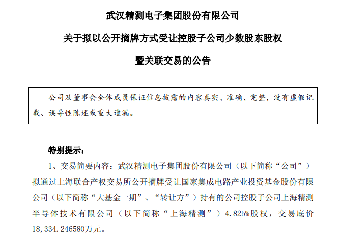 531日,精測電子(300567)公告,公司擬通過上海聯合產權交易所公開摘牌受讓國家集成電路產業投資基金股份有限公司(簡稱大基金一期”)持有的公司控股子公司上海精測半導體技術有限公司(簡稱上海精測”)4.825%股權,交易底價18,334.246580萬元。本次交易構成關聯交易,未構成重大資產重組,本次交易尚需公司股東大會審批通過。