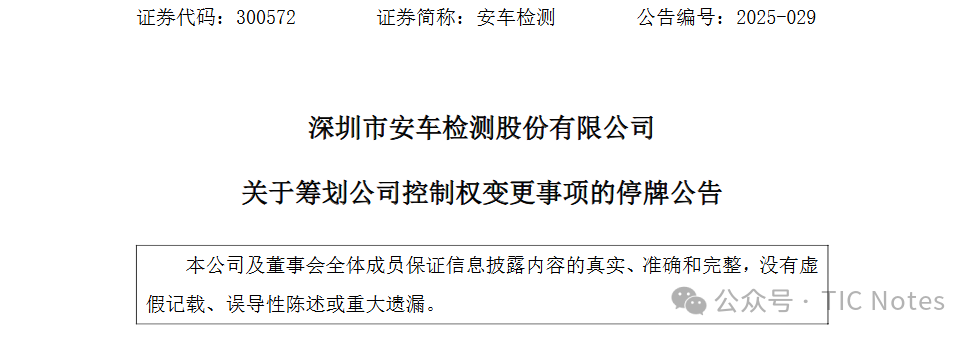 2025年7月29日,深圳市安車檢測(cè)股份有限公司發(fā)布《關(guān)于籌劃公司控制權(quán)變更事項(xiàng)的停牌公告》,公告顯示,公司于今日收到控股股東及實(shí)際控制人賀憲寧的通知,其正在籌劃股權(quán)轉(zhuǎn)讓及控制權(quán)變更相關(guān)事宜,該事項(xiàng)可能導(dǎo)致公司控股股東和實(shí)際控制人發(fā)生變更。目前各方尚未簽署相關(guān)正式交易協(xié)議,擬就具體交易方案、協(xié)議等相關(guān)事項(xiàng)進(jìn)行論證和磋商,具體情況以各方簽訂的相關(guān)正式交易協(xié)議為準(zhǔn)。