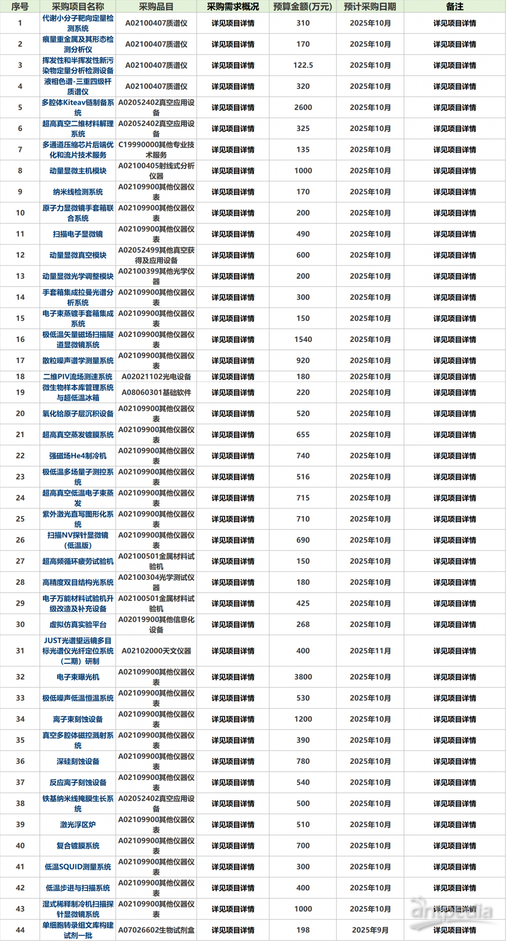 中國政府采購網(wǎng)消息,近日,上海交通大學(xué)連續(xù)發(fā)布2025年度9月、10月及11月政府采購意向。內(nèi)容顯示,該批次采購意向采購標(biāo)的涵蓋多類科研儀器設(shè)備及專業(yè)技術(shù)服務(wù),包括代謝小分子靶向定量檢測系統(tǒng)、液相色譜  -三重四級(jí)桿質(zhì)譜儀、極低溫矢量磁場掃描隧道顯微鏡系統(tǒng)等。公開信息顯示,該批次采購預(yù)算總金額達(dá)到2.67億元,采購日期方面,除“單細(xì)胞轉(zhuǎn)錄組文庫構(gòu)建試劑一批”及“JUST光譜望遠(yuǎn)鏡多目標(biāo)光譜儀光纖定位系統(tǒng)(二期)研制”將于9月和11月采購之外,其余項(xiàng)目均將于10月份進(jìn)行采購。具體信息已項(xiàng)目相關(guān)采購公告和采購文件為準(zhǔn)。