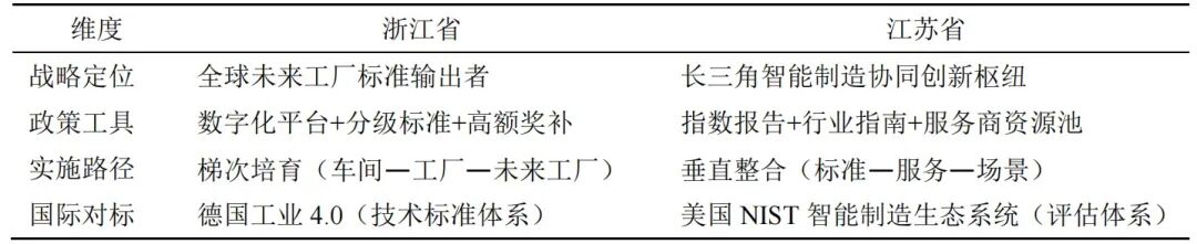 在戰(zhàn)略定位維度:浙江省瞄準(zhǔn)全球未來(lái)工廠標(biāo)準(zhǔn)輸出,依托先進(jìn)實(shí)踐構(gòu)建國(guó)際話語(yǔ)權(quán);江蘇省聚焦長(zhǎng)三角協(xié)同發(fā)展,整合區(qū)域資源打造智能制造創(chuàng)新樞紐。