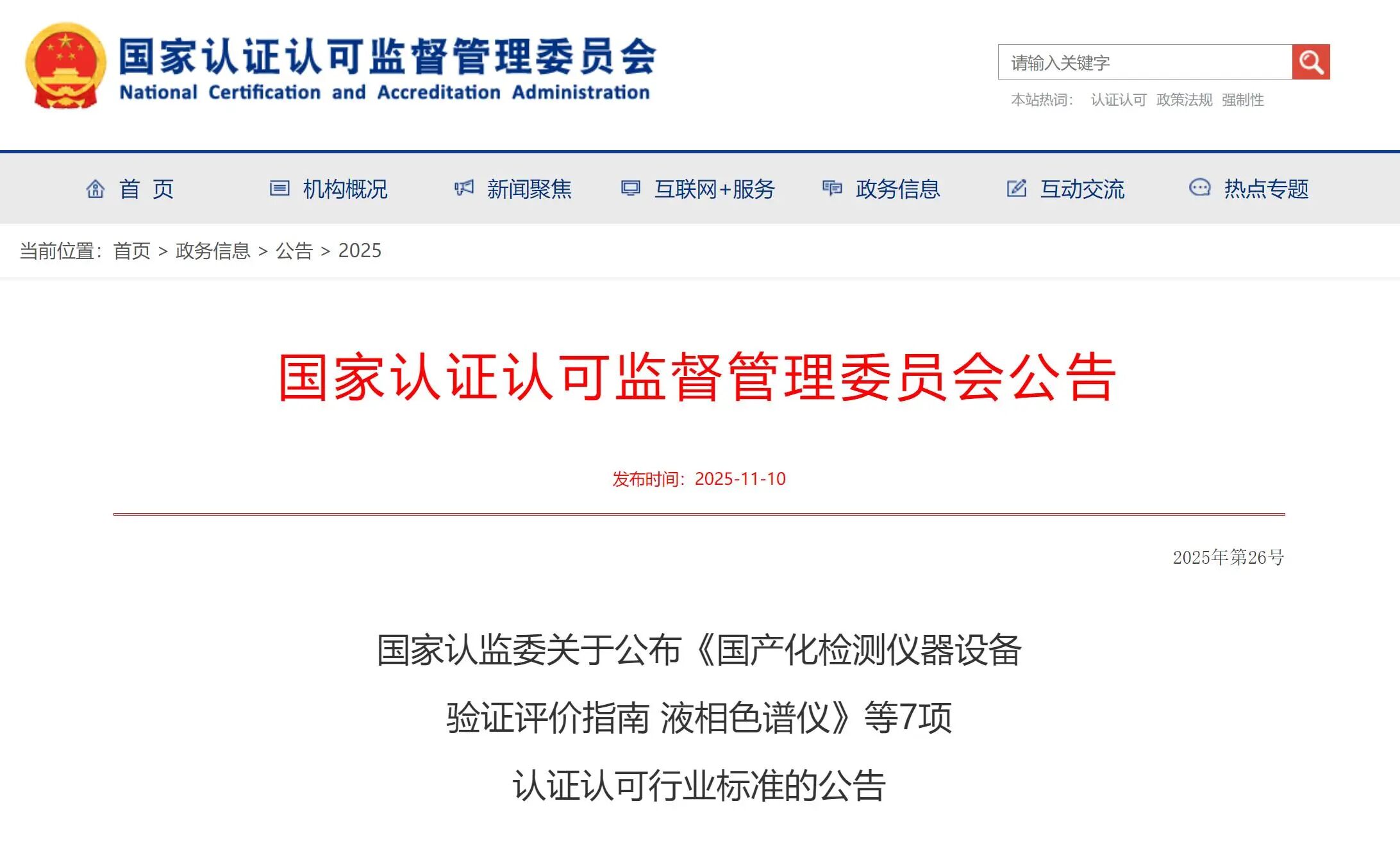 《國產(chǎn)化檢測儀器設(shè)備驗證評價指南 液相色譜儀》等7項認證認可行業(yè)標準已經(jīng)國家認監(jiān)委審核,現(xiàn)予公告。