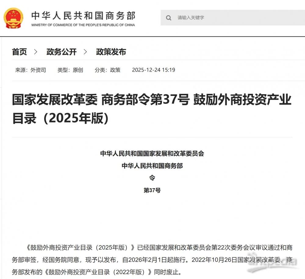 近日,經(jīng)國務(wù)院同意,國家發(fā)展改革委、商務(wù)部全文發(fā)布《鼓勵外商投資產(chǎn)業(yè)目錄(2025年版)》(以下簡稱《鼓勵目錄》),自202621日起施行。