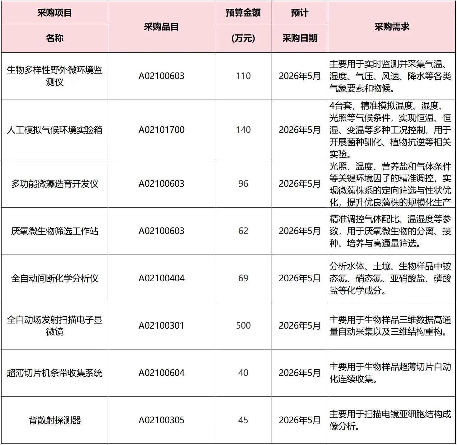 本次采購共涉及8個品目,核心設備包括:全自動場發射掃描電子顯微鏡、全自動間斷化學分析儀、生物多樣性野外微環境監測儀、厭氧微生物篩選工作站人工模擬氣候環境實驗箱(4臺套)等。