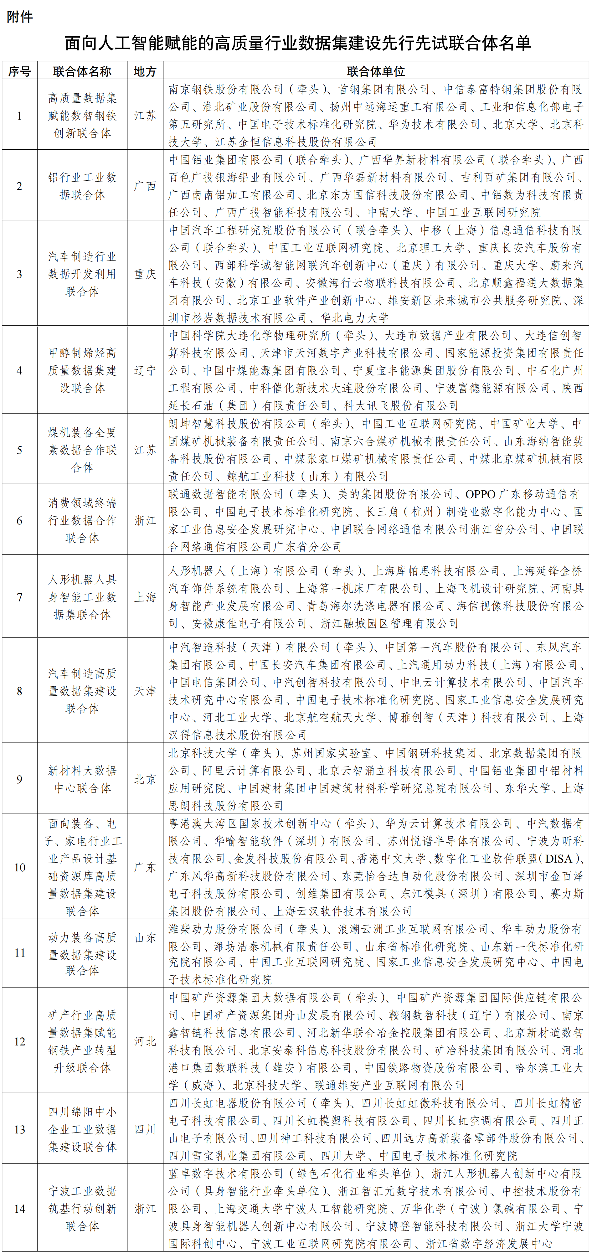 關于公布面向人工智能賦能的高質量行業數據集建設先行先試聯合體名單的通知