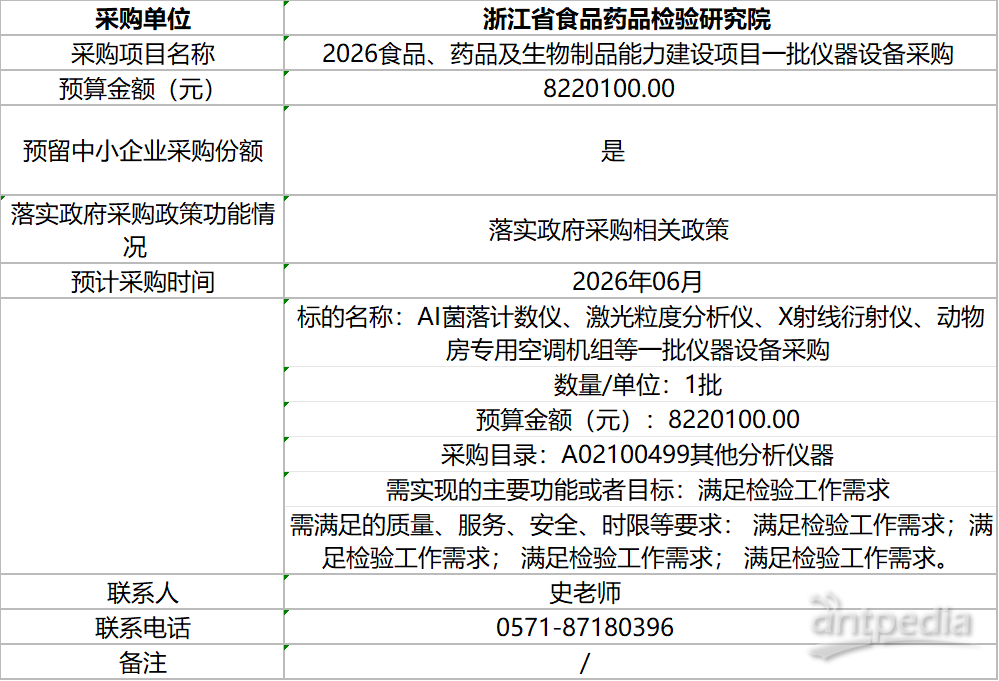 423日,浙江食藥檢院發(fā)布20266月至12月政府采購意向,擬采購AI菌落計數(shù)儀、激光粒度分析儀、X射線衍射儀、動物房專用空調機組等一批儀器設備,預算金額為822.01萬元。