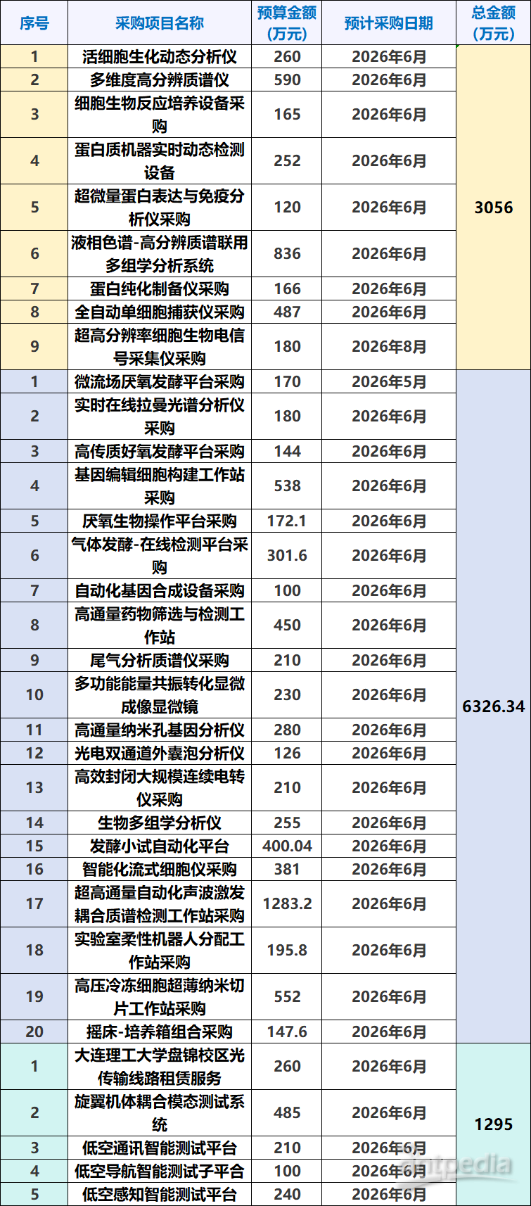 據中國政府采購網近日消息,繼公布6326.34萬元采購意向后,大連理工大學再發布多項2026年政府采購意向,采購預算金額分別為3056萬元、1295萬元,擬采購設備包含液相色譜-高分辨質譜聯用多組學分析系統、全自動單細胞捕獲儀、多維度高分辨質譜儀等大型精密儀器。